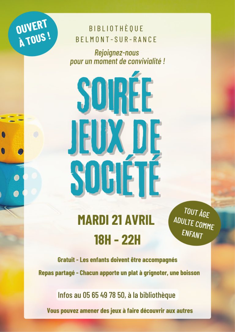 La bibliothèque vous propose une soirée jeux de société : Mardi 21 avril, 18h-22h Ouvert à tous, tout âge Gratuit – les enfants doivent être accompagnés Repas partagé – chacun apporte un plat à grignoter, une boisson Vous pouvez amener des jeux à faire découvrir aux autres. Infos au 05 65 49 78 50, à […]
