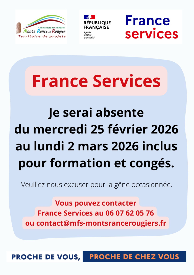 La France Services sera fermée du mercredi 25 février au lundi 2 mars 2026 inclus, pour formation et congés.