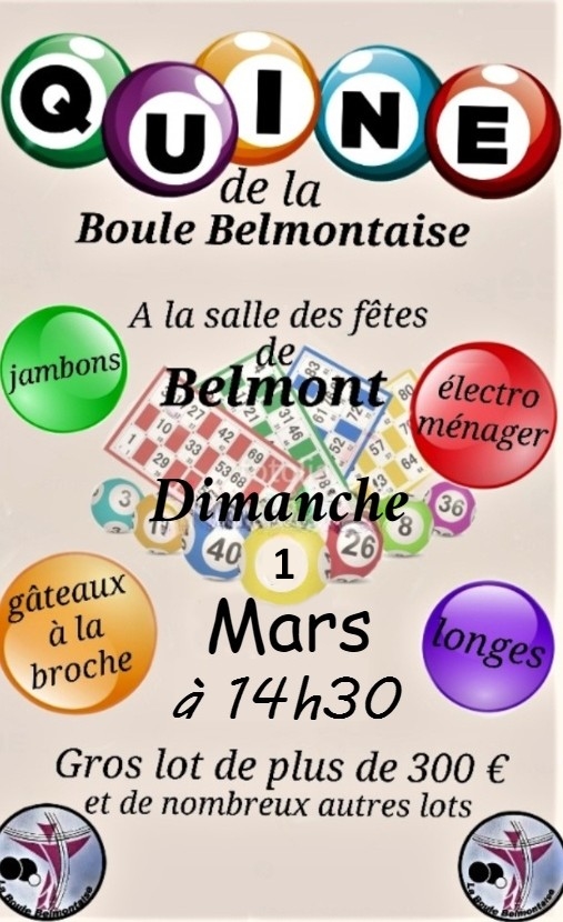 Dimanche 1er mars À 14h30 À la salle des fêtes Gros lot de plus de 300€ De nombreux lots : jambons, gâteaux à la broche, électroménager, longes…
