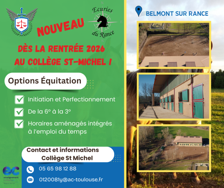 NOUVEAUTÉ – Rentrée 2026 au Collège Saint-Michel ! Le collège Saint-Michel situé à #belmontsurrance en Sud-Aveyron, propose dès la rentrée 2026 deux options « Équitation » avec Les écuries du Rance. Ces formations seront ouvertes aux élèves de la 6ème à la 3ème. Option initiation : pour découvrir le monde du cheval, apprendre les bases de l’équitation, […]