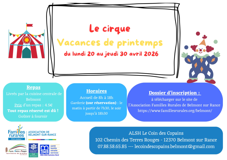 Vous trouverez en pièce jointe, le planning pour les vacances d’hiver, du lundi 20 au jeudi 30 avril 2026. Les activités proposées seront sur le thème « Le cirque » Les enfants pourront fabriquer, au cours des vacances, des animaux du cirque : lion, éléphant, girafe… ou encore un jongleur. Ils partiront à la recherche des animaux qui se sont […]