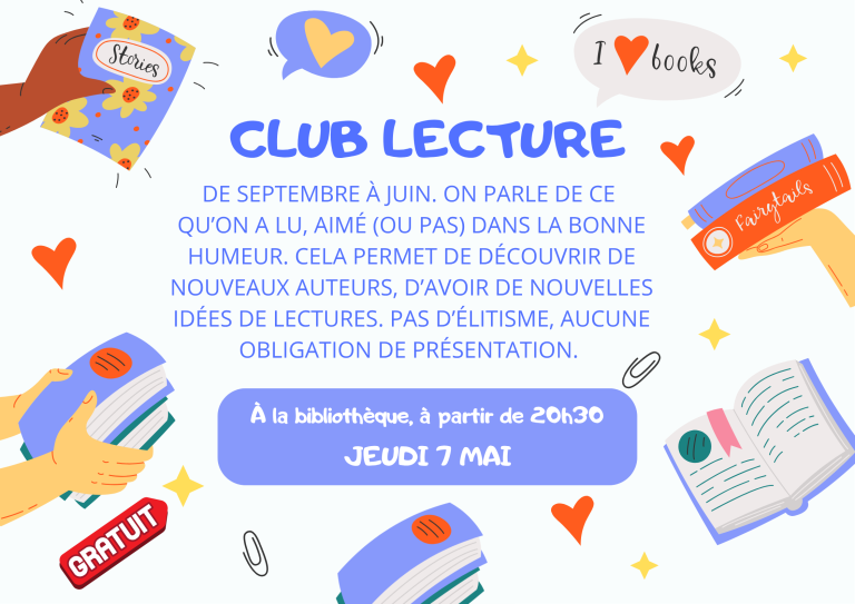 Jeudi 7 mai À la bibliothèque, à partir de 20h30 Ouvert à tous – gratuit Le principe : DE SEPTEMBRE À JUIN. ON PARLE DE CE QU’ON A LU, AIMÉ (OU PAS) DANS LA BONNE HUMEUR. CELA PERMET DE DÉCOUVRIR DE NOUVEAUX AUTEURS, D’AVOIR DE NOUVELLES IDÉES DE LECTURES. PAS D’ÉLITISME, AUCUNE OBLIGATION DE PRÉSENTATION. […]