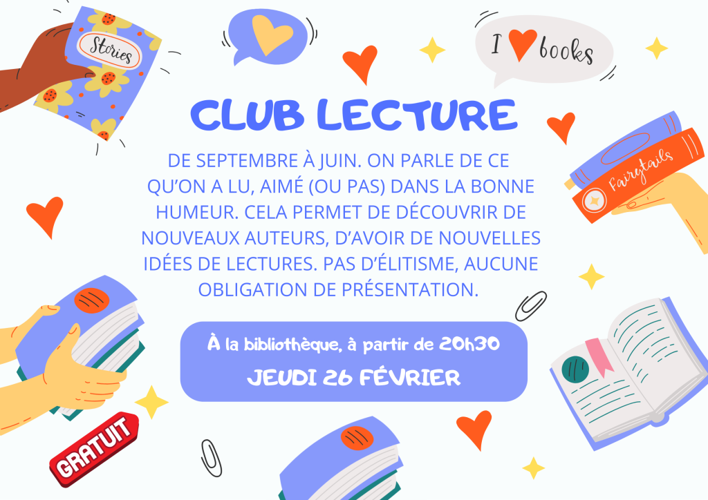 DE SEPTEMBRE À JUIN. ON PARLE DE CE QU’ON A LU, AIMÉ (OU PAS) DANS LA BONNE HUMEUR. CELA PERMET DE DÉCOUVRIR DE NOUVEAUX AUTEURS, D’AVOIR DE NOUVELLES IDÉES DE LECTURES. PAS D’ÉLITISME, AUCUNE OBLIGATION DE PRÉSENTATION.